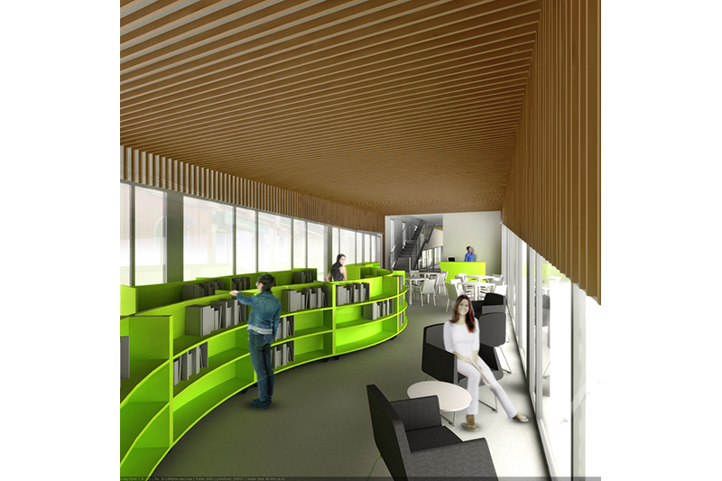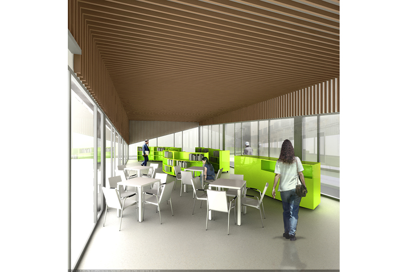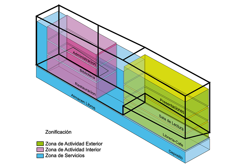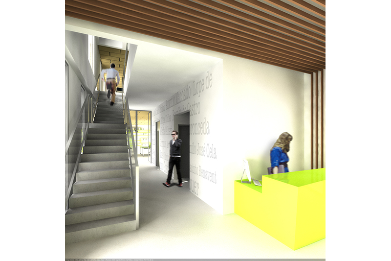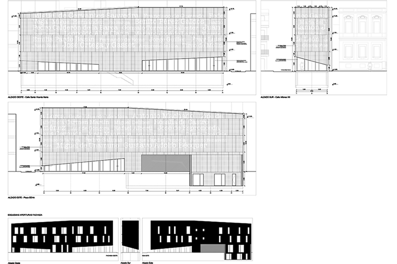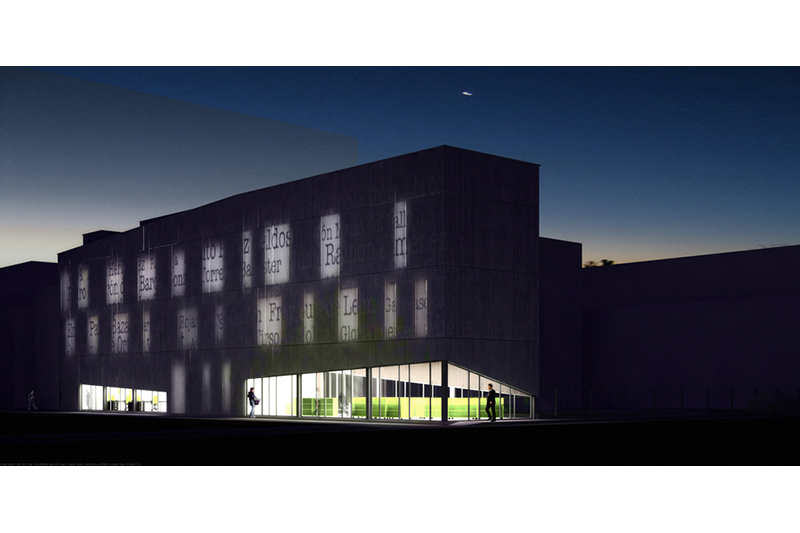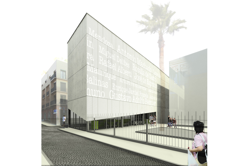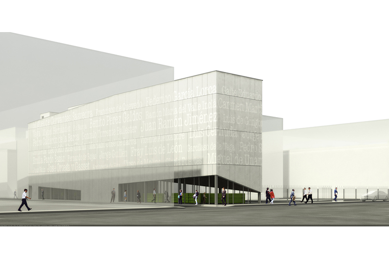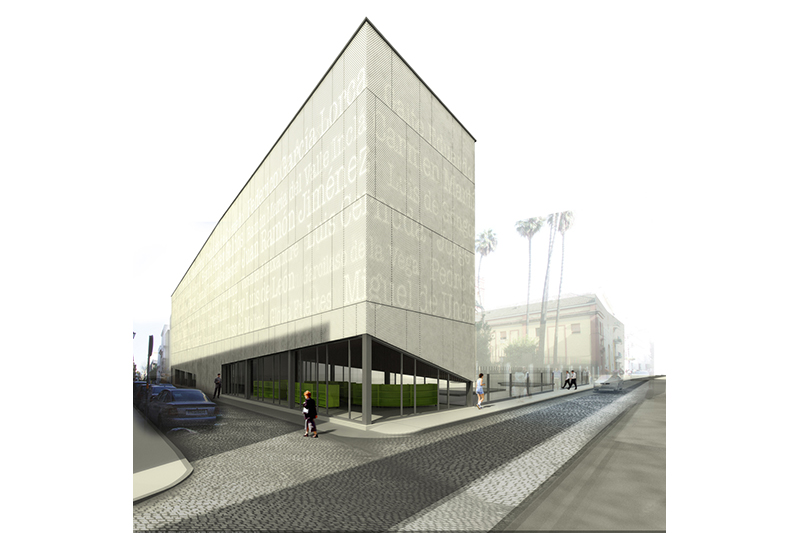 La fachada aparece como una superficie hecha de paneles homogéneos y texturizados que protege el espacio interior del sol directo, y simultáneamente proporciona expresividad. Las perforaciones en los paneles dibujan una secuencia de nombres de los escritores españoles, generando una clara identificación del carácter cultural del edificio. El punto de confluencia de las 2 calles presenta las interacciones más urbanas. El proyecto busca aquí revitalizar y contribuir a su dinamismo, interactuando con los flujos y las tensiones entre el tráfico peatonal, los jardines de la EEHA y el interior de la biblioteca. En este punto, la fachada pierde parte de su homogeneidad y solidez al sobreexponer la librería y la cafetería, invitando a la gente a ingresar a la exposición