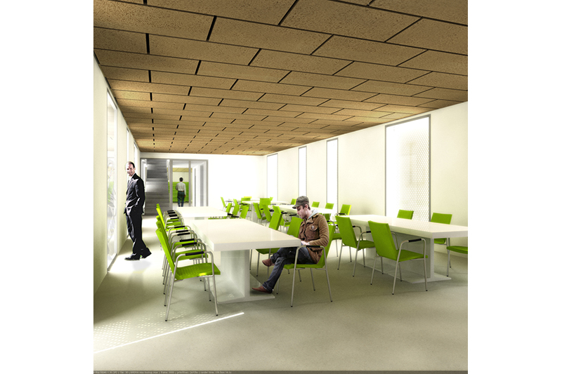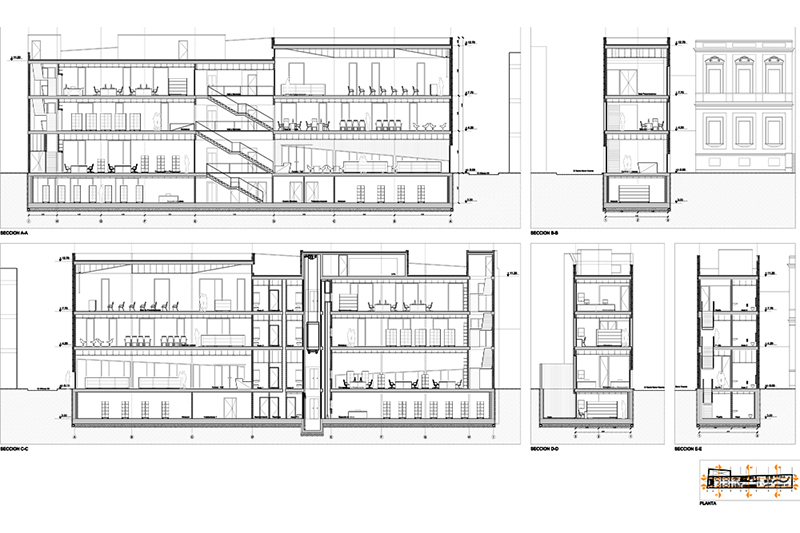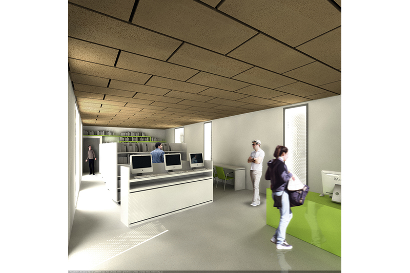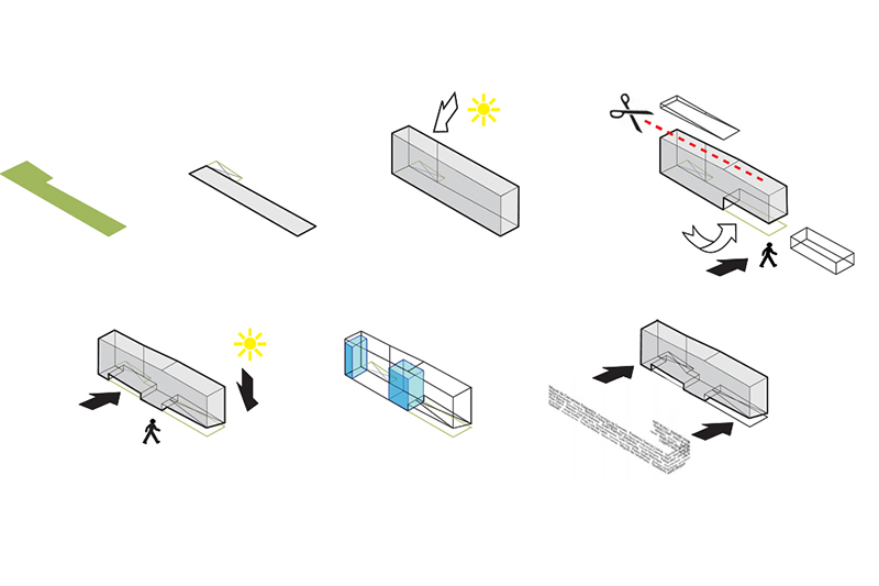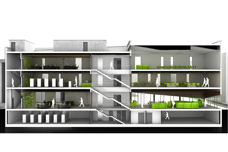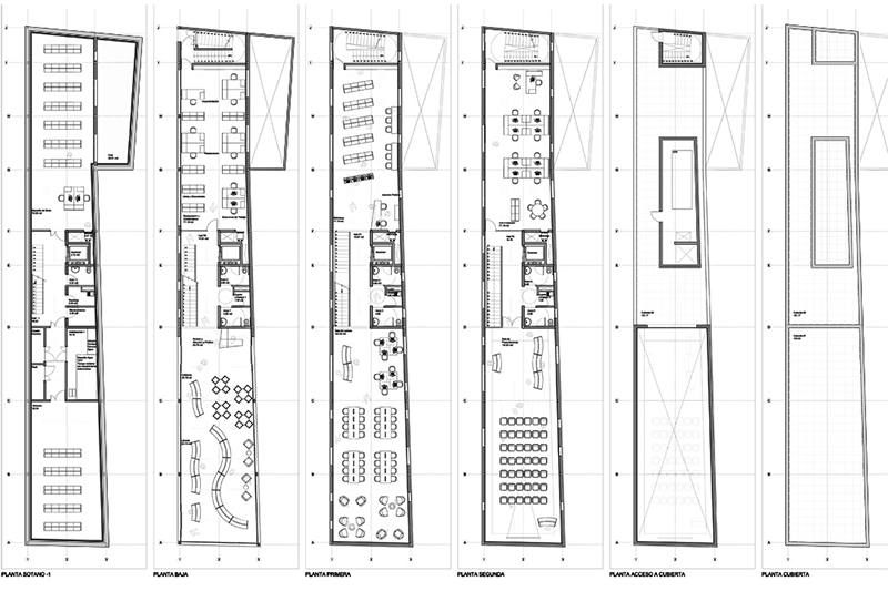 Siguiendo la forma irregular del lote, el edificio se alinea en ambas calles y con el límite de la Escuela de Estudios Hispanoamericana (EEHA), en la que encuentra un espacio propicio para abrir un frente hacia sus jardines. Actuando como telón de fondo, el edificio genera flujos, actividades y regenera un espacio verde que hoy es inútil, y que por cierto esta integrado en la secuencia de espacios verdes y públicos de Sevilla.