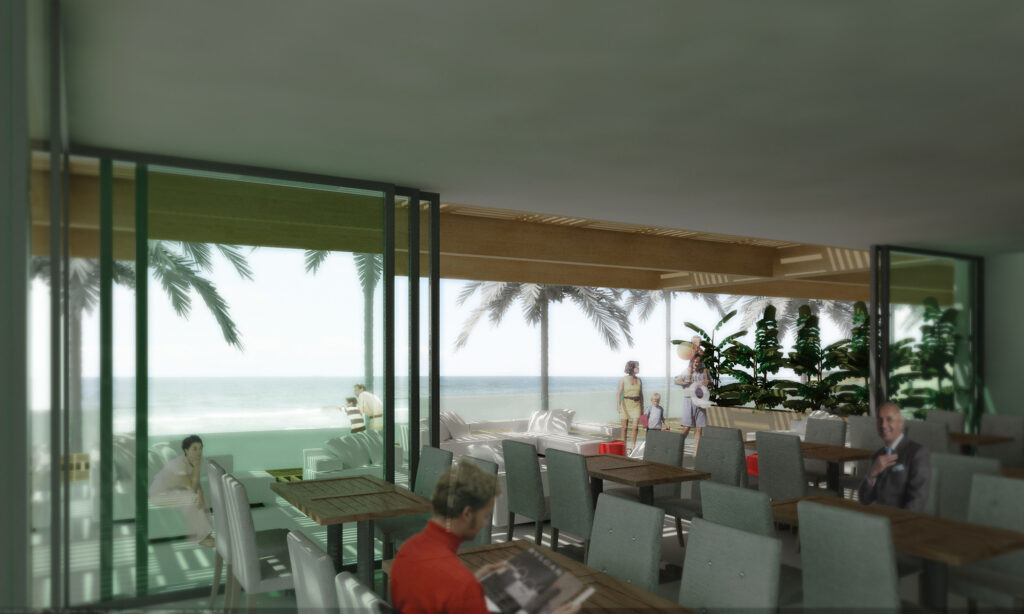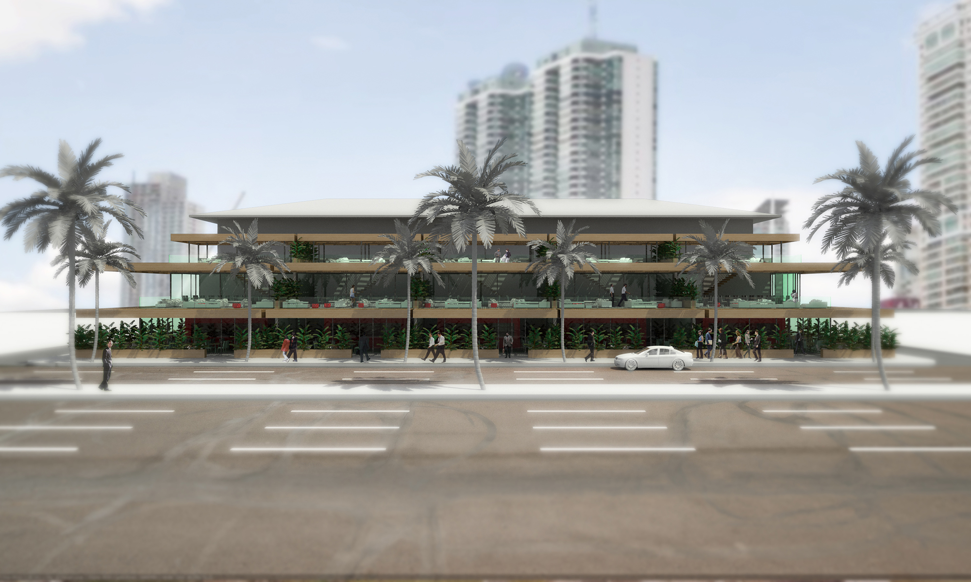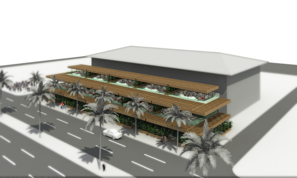 Nuestra propuesta borra los limites clásicos de un edificio comercial para transformar los locales en una experiencia física en la cual los limites entre interior y exterior desaparecen, dejando únicamente el placer de gozar la vista en un ambiente sombreado, fresco y acogedor.