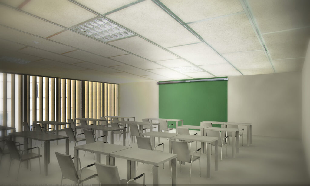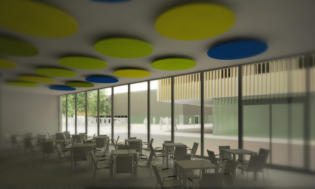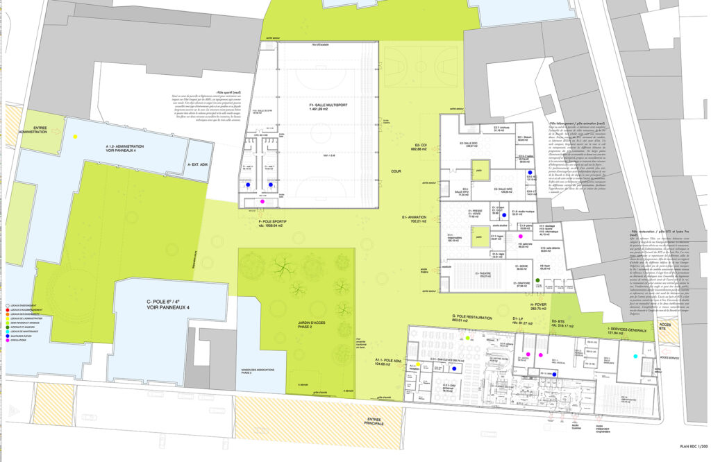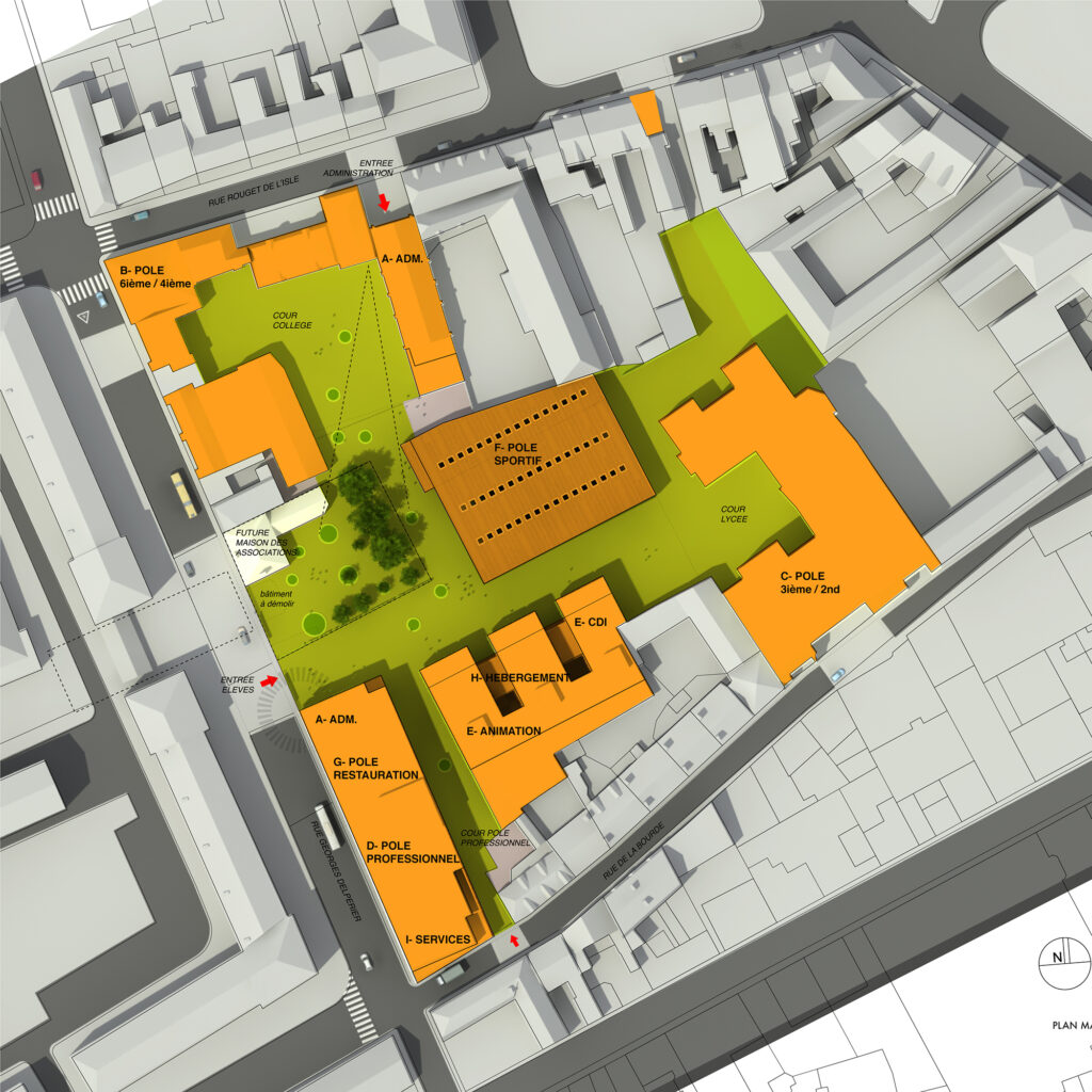El atrio semi-privado es una verdadera Ágora alrededor del cual los diferentes elementos del programa se organizan. Este sitio será el de las concentraciones y de los eventos que van a interactuar con el vecindario. La organización de los edificios se hacen más o menos accesibles en función de la planificación escolar: El gimnasio y el aparcamiento, aulas, internado y restaurantes se podrán compartir o alquilar para los seminarios de verano, acontecimientos deportivos, etc. La torre existente esta renovada, fagocitada por el nuevo programa para abrir el centro de la isla y conectar los edificios existentes con el nuevo CDI como pivote : una calidad de vi(d)a evidente! La cultura y el deporte está en el centro del proyecto, mientras que el tiempo de la restauración abierto hacia la ciudad.