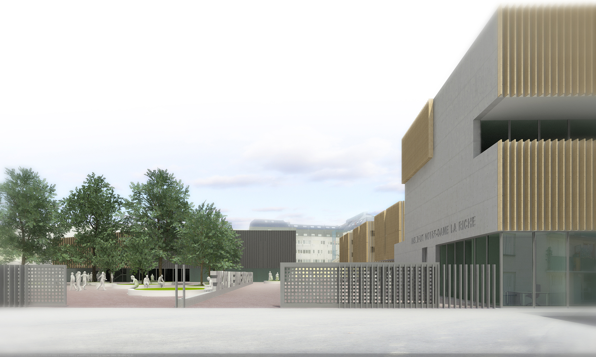 El Instituto Notre dame la Riche anima desde siempre el barrio entero. Todas las escuelas y los anexos, la proximidad de la escuela infantil Charles Boutard y primaria Georges Sand, la asociación Chantemoulin, y el gimnasio calle Dabilly consoliradará la vocación de esta zona dedicado a la enseñanza. Nuestra propuesta quiere afirmar el estado de “campus urbano”, proponiendo que la Notre Dame LA Riche sea su foro. En esta «ciudad dentro de la ciudad» la calle Georges Delpérier y Rouget de Lisle forman el cardo y el decumanus. Los límites físicos de la manzana se hacen porosos para crear una plaza de acceso calle Delperier y un escaparate urbano plaza Rouget de Lisle. Por otro lado el interior del bloque será tratado como espacio público: calles, plazas, zonas ajardinadas serán una experiencia urbana y cívica para los estudiantes del Instituto. Inicialmente, el programa incluye un gimnasio, un nuevo centro de documentación, un internado con capacidad para 200 personas, un nuevo edificio para 10 salas de BTS, una cocina industrial, un comedor y un edificio administrativo nuevo.