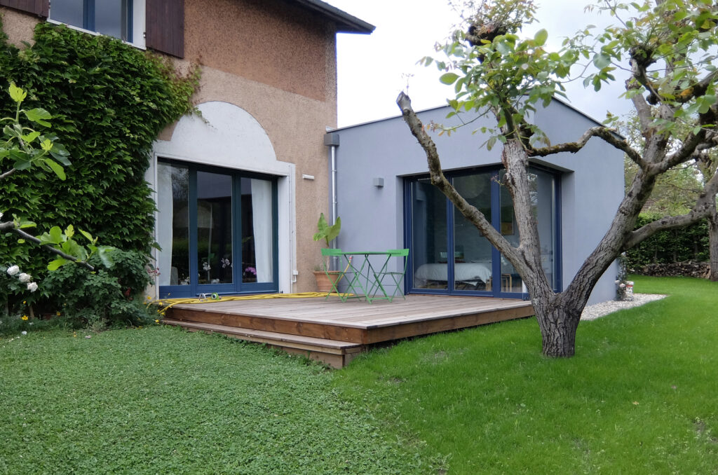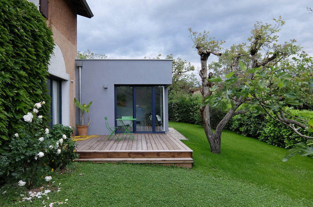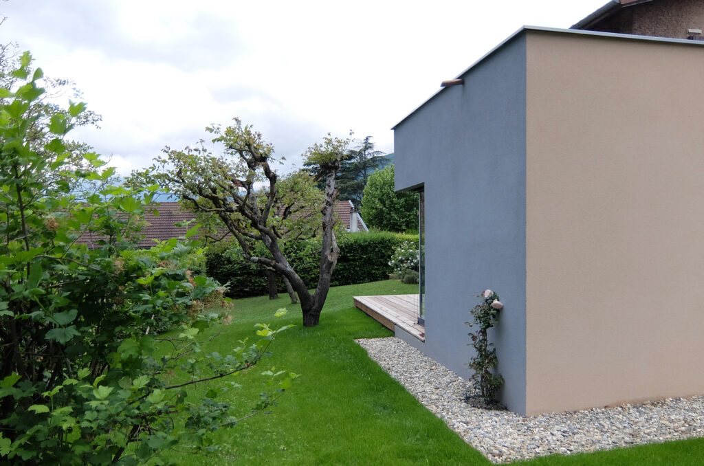 Se aprovecha la necesidad de ampliación de este pabellón en las afueras de Grenoble para remodelar y reorganizar su jardín y acceso principal.