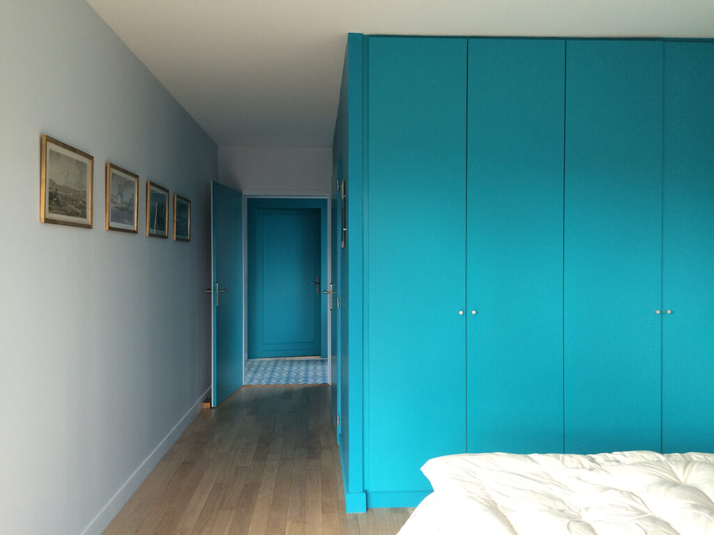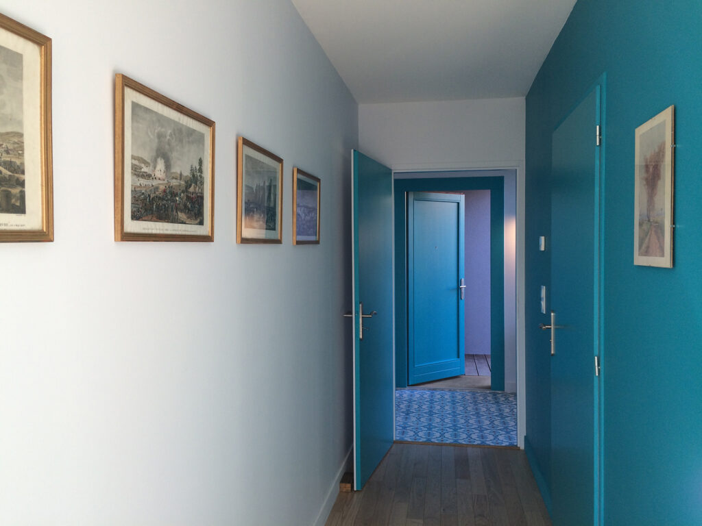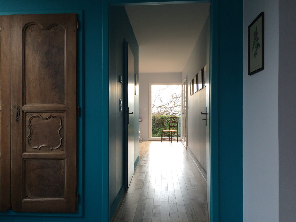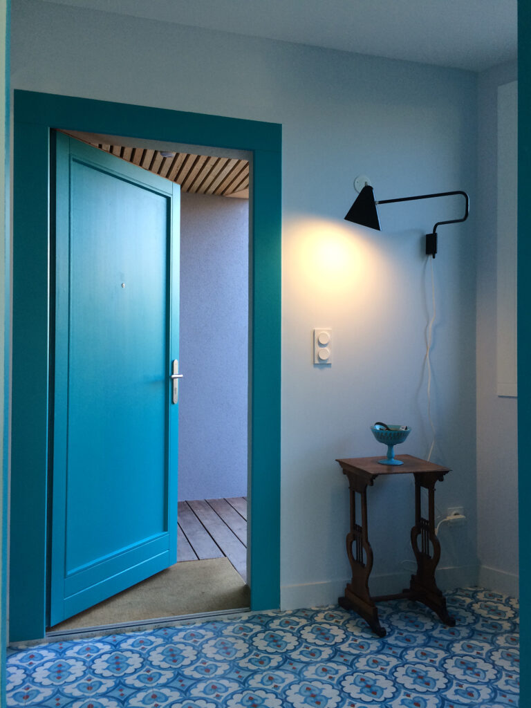 El volumen contemporáneo entra en ruptura con la volumetría existente pero un sabio juego de colores de los revocos inicia un dialogo entre las 2 construcciones.