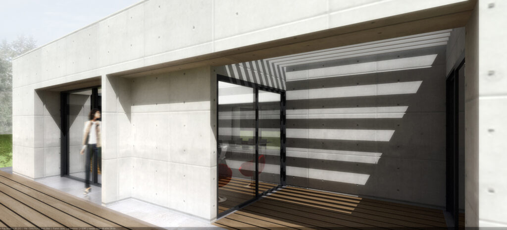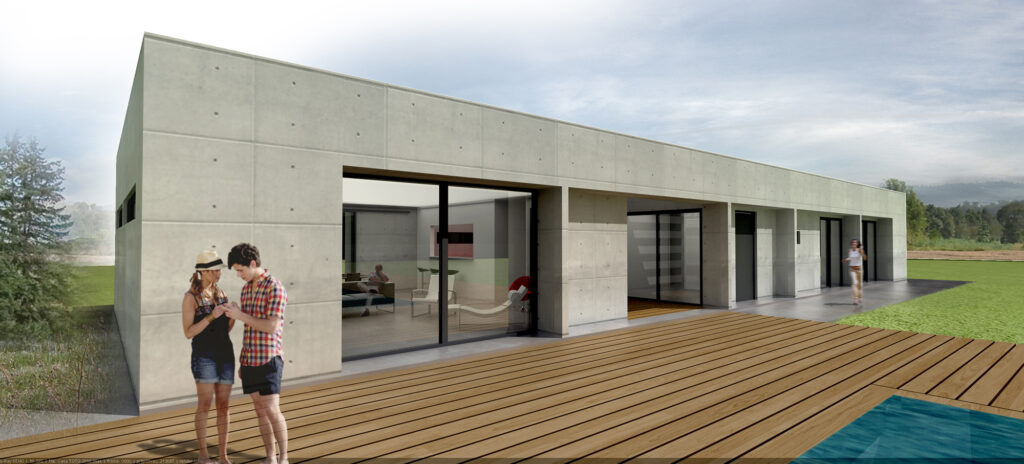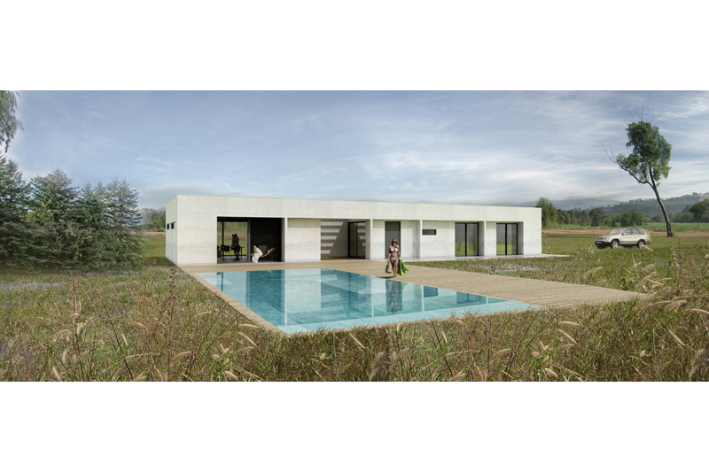 La construcción de hormigón esta pensada como una caja maciza que juega con las diferentes luces del día y sus fachadas reflejan la organización racional de su interior. Este se organiza en dos zonas distintas, la de día muy abierta y conectada con el exterior y la de noche, funcional y aislada de la actividad diurna.