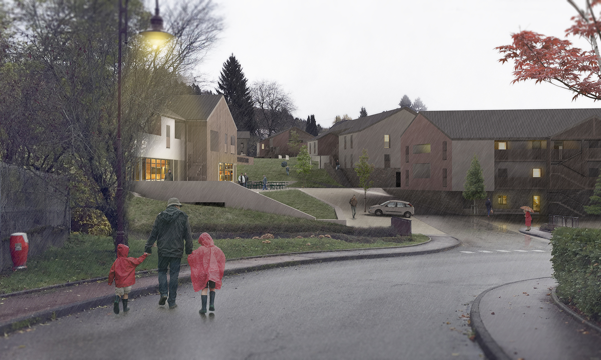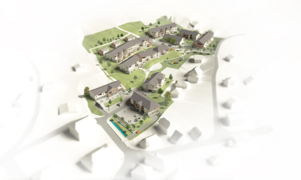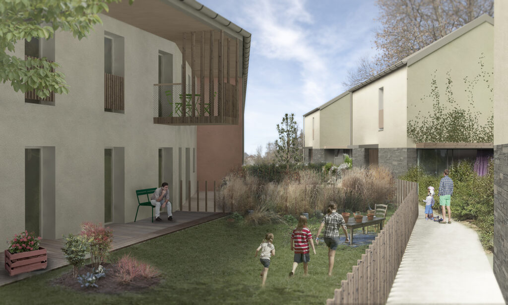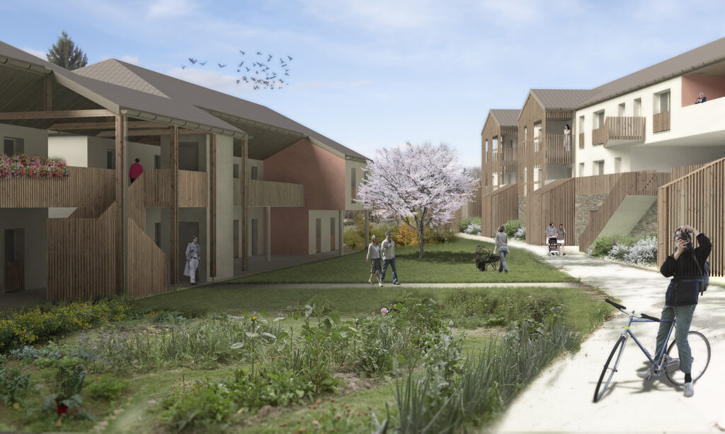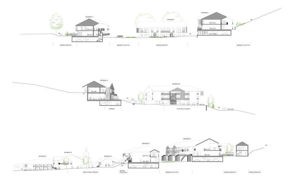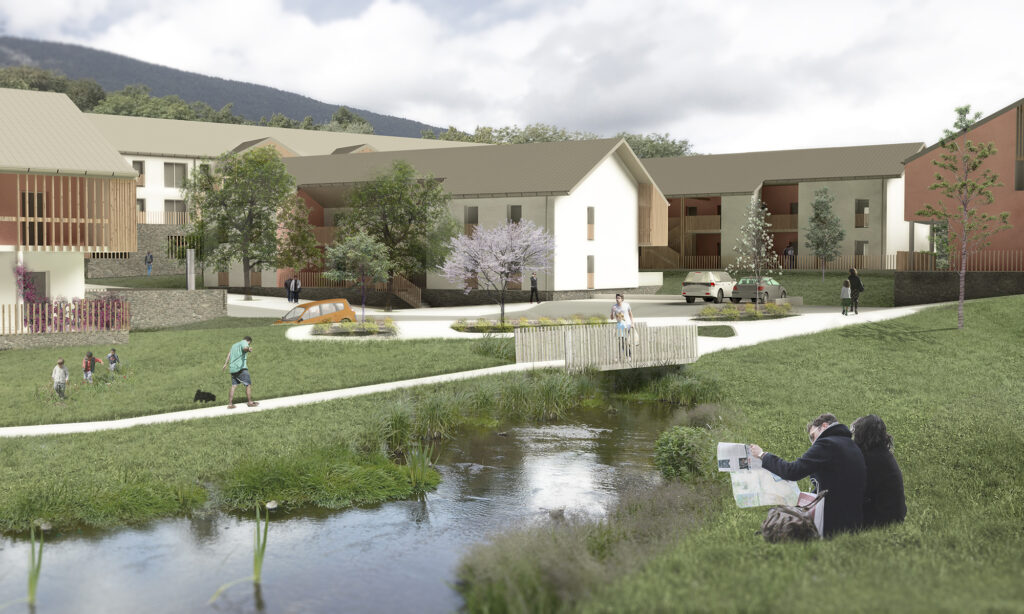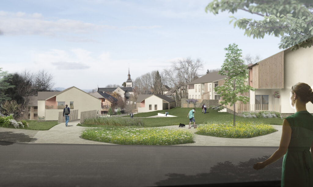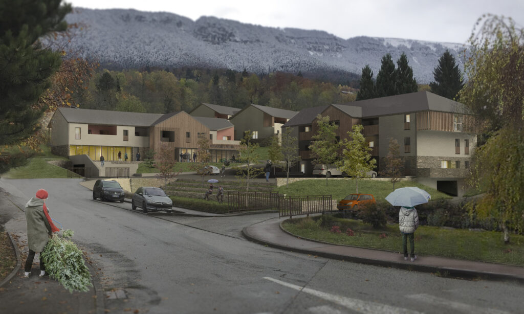 El proyecto tiene como objetivo desarrollar una consecuente oferta de la vivienda, siempre manteniendo el control de la imagen que fabrica esta proposición. La ecuación compleja que la arquitectura debe resolver es permitir el despliegue de los estilos de vida urbanos en el lugar sin que estos estilos de vida trivializan la arquitectura y la imagen global del proyecto. Esta ecuación traduce en objetivos arquitectónicos el equilibrio entre el desarrollo urbano y la preservación de los espacios naturales y agrícolas que el PNR de los Bauges tiene que manejar. Así, el proyecto propuesto aporta su estilo arquitectónico y esta búsqueda de equilibrio.
